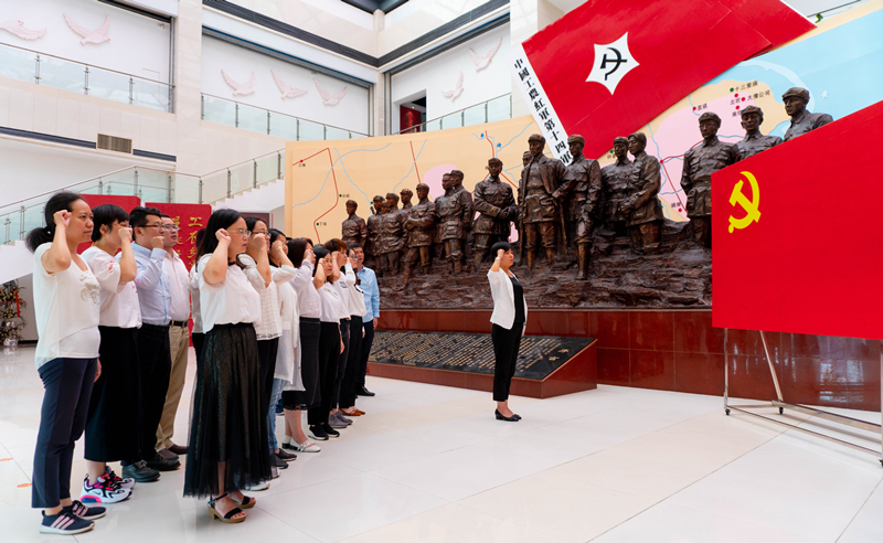 在纪念馆,学院党委书记张莉莉带领全体成员,庄严肃穆地举起右手,面对鲜艳的党旗,重温入党誓词,并齐声喊出:“凝心聚力,砥砺前行,为实现‘8050’和‘中国梦’而努力奋斗!”。现场铮铮誓言响彻了整个纪念馆,充分彰显了同志们众志成城、炽热深厚的爱校、爱国情怀。随后,大家参观了8个展厅,在还原历史的场景前认真听取介绍,感受当年红十四军肩负的壮烈使命,深切缅怀烈士英灵,时刻牢记历史遗训,告慰战争岁月里为祖国抛头颅、洒热血的革命先辈们,对他们为革命事业献身的无私精神表现出崇高的敬意。期间,大家还驻足在廉政教育基地前,接受廉政警示教育,增强防腐抗变能力,使党员干部时刻牢记使命,建功新时代。