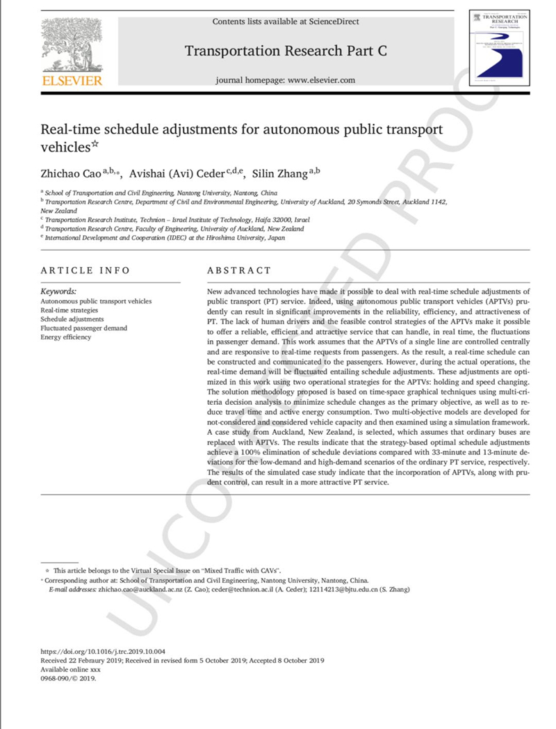 近日,365英国上市公司在线交通运输系教师曹志超博士与Avi Ceder教授、张思林博士,在交通领域顶级Top期刊Transportation Research Part C上以第一作者、通讯作者、365上市公司为第一单位发表题为《Real-time Schedule Adjustments for Autonomous Public Transport Vehicles(无人驾驶公交车的实时自动化控制)》的学术论文。