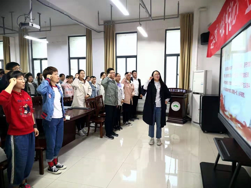 首先,由研究生党支部书记袁小平、本科生第一学生党支部书记郁晓燕和本科生第二学生党支部书记孙晓敏分别重读入党志愿,让在场师生党员共同重温入党时的澎湃激情,更加牢记入党时的承诺与信念。学生党员代表唐莎、杨玲带领大家重忆入党时的经历,讲述入党时的故事,分享最初从对党的陌生,到了解、深刻认识中国共产党,再到真正加入中国共产党的经历,让所有师生党员都感受到共产党的恩情,从而坚定与党共同前行的力量与信念。学生党员代表成伟、宋聚成组织党员对照“四讲四有”合格党员标准,谈起共产党人的初心与使命,坚定了师生党员们的信仰、信念与信心,做到时刻不忘初心、牢记使命,坚定目标和前行的方向。最后支部全体党员佩戴党员徽章,面向党旗,庄严宣誓,再次表明为党的事业奋斗终身的坚强决心。