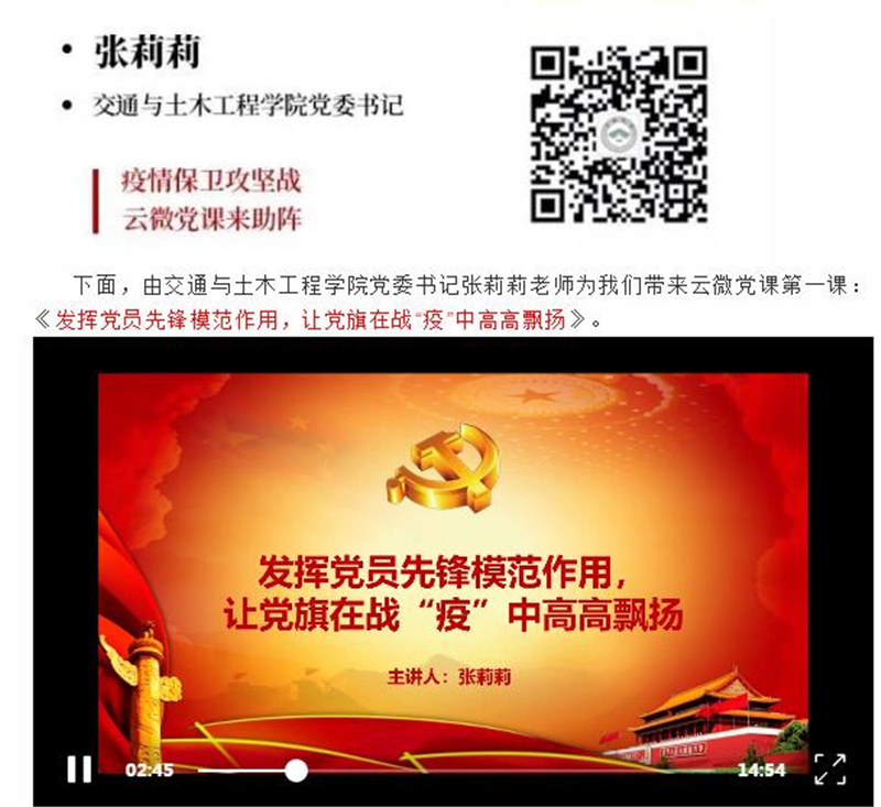 3月9日,在复工复学的关键时期,365英国上市公司在线将党课学习搬上了“云端”,学院党委书记张莉莉以《发挥党员先锋模范作用,让党旗在战“疫”中高高飘扬》为题,为全院学生党员带来了一堂特别的专题云微党课,做到防疫战疫与学习两不误。