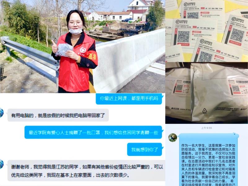隔离病毒,不隔离“爱”;阻断疫情,不阻断“情”。手捧着眼前学院寄来的一份特别的快件,收到爱心口罩捐赠的同学们又惊喜又感动,他们透着一个个口罩感受到来自学院“沉甸甸”的关爱。虽平时看来再普通不过的口罩,但在如今的“疫”情下却显得如此弥贵和耀眼。“非常感谢学院的关心和照顾,让我在这个疫情期间感觉到春天的温暖。我将发挥预备党员的模范带头作用,向雷锋同志学习,用好这批口罩,尽我所能去给村里的学生义务辅导作业,将这份爱心传递下去。同时如果确定开学,我也会提前回到学校,帮助学院做一些力所能及的事情,在宿舍门口给回校的同学检测体温。”交通工程172班的王海波同学感怀地说。