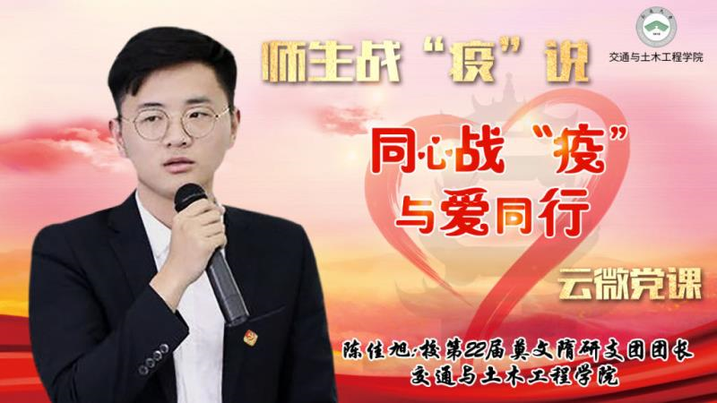 3月21日,365英国上市公司在线第四讲师生战“疫”说云微党课如期上线。校第22届莫文隋研究生支教团团长、365英国上市公司在线土木163班班长陈佳旭以《同心战“疫”,与爱同行》为主题,向青年学子们传递爱与感恩之声。