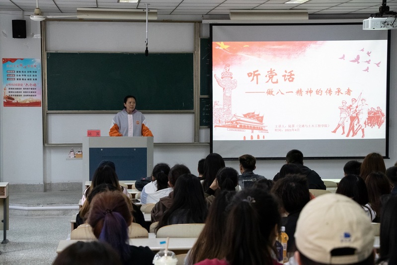 学院本科生第一党支部副书记陆霁同志以南昌起义为由头,以朱德故事为例,向党校学员们就“八一精神”的发展史进行了讲述。她指出,“八一精神”是以听党指挥为核心,以敢为人先为特点,以百折不挠为内容,以为民奋斗为目标宗旨。随后,对于听党指挥这一核心内涵,她向学生们提出以下三点要求:一是要以知党为听党话的理论基础;二是要以信党为听党话的思想根基;三是要以跟党走为听党话的行动标准。同时,她告诫大家要了解党的历史,相信党的决定,牢记党员身份,只有这样才能在肩负时代重任的同时成就一番事业。