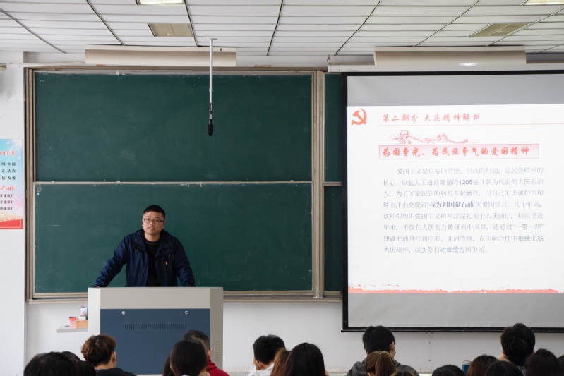 学院辅导员王振向学员们阐述了大庆精神的形成、时代含义及其文化传承。他指出,大庆精神是以“铁人”王进喜为代表的老一辈领导人和广大石油职工在艰苦岁月中逐渐培养和形成的,无论是曾经、现在或是将来,大庆精神都应是激励人们不断奋斗的精神力量。随后,他又讲述了大庆精神的时代意义,即为国争光、为民族争气的爱国精神;独立自主、自力更生的艰苦创业精神;讲求科学、三老四严的求实精神;胸怀全局、为国分忧的奉献精神。最后,他还特别强调大庆精神不仅仅代表力量,更代表智慧,是所有大庆人乃至全中国人民的力量与智的象征。