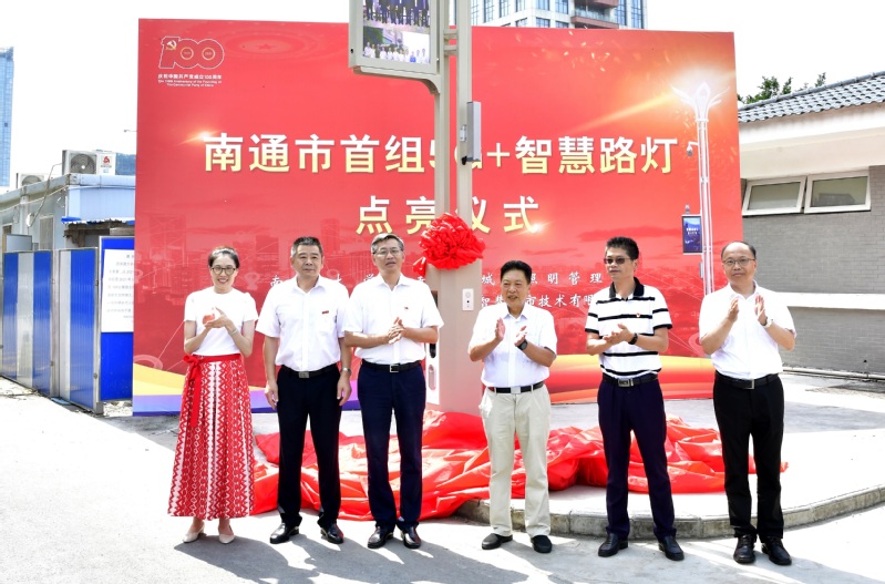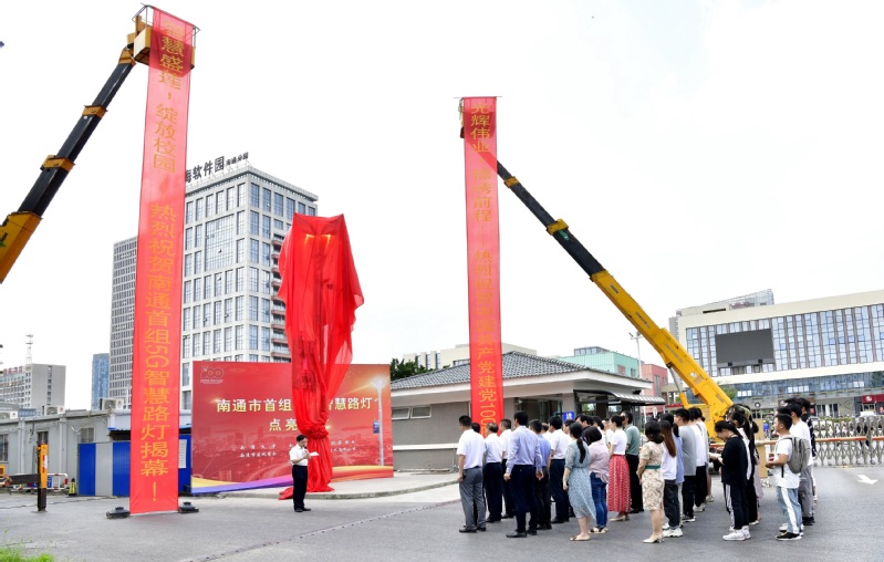 7月1日下午,南通市首组5G+智慧路灯点亮仪式在我校举办。校党委书记浦玉忠,校党委常委、总会计师姜佩剑,校党委常委、副校长杨宇民与南通市城市照明管理处主任蔡卫强、南通市盐城商会名誉会长王保京、江苏恒鹏智慧城市技术有限公司董事长武军权,共同为南通市首组 5G+智慧路灯点亮揭幕。