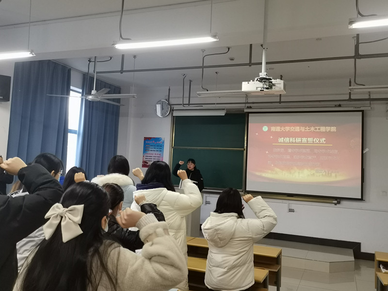 研究生辅导员袁小平呈现了三个典型的学术不诚信案例,着重阐述不遵守学术规范带来的严重后果,并对全体研究生提出三点具体要求:一是要脚踏实地,共同营造优良学风;二是要精益求精,勇于攀登学术高峰;三是要厚德笃行,恪守学术道德底线。研究生2021级交通专硕刘佳丽作为研究生代表,带领大家进行了研究生学术道德与科研诚信宣誓。