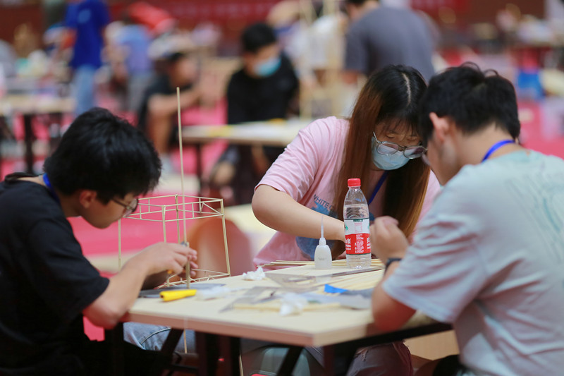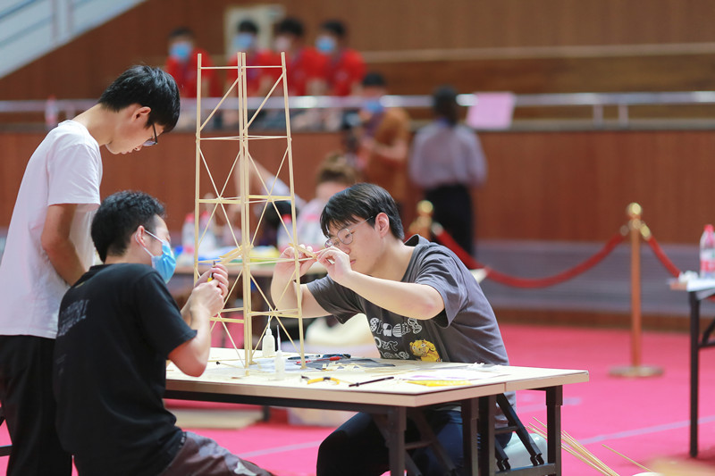 此次比赛共吸引来自东南大学、南京航空航天大学、河海大学、365上市公司等36支代表队近400余名师生参赛,共有34组作品参加模型加载组比赛,60件作品参加展示组比赛。加载组比赛共评出特等奖2项,一等奖5项,二等奖13项;展示组比赛共评出特等奖3项,一等奖9项,二等奖21项。经过激烈角逐,2020级土木工程专业的韦盛阳、仲栋宇、潘书勇三名同学(指导教师:吴昌将、钱王苹)与2020级土木工程专业的曹垒、吴阳、叶浩天三名同学(指导教师:沈强儒、钱王苹)凭借周密的配合、稳定的发挥,优异的模型制作、现场陈述与问答以及模型现场加载表现,喜获二等奖一项。